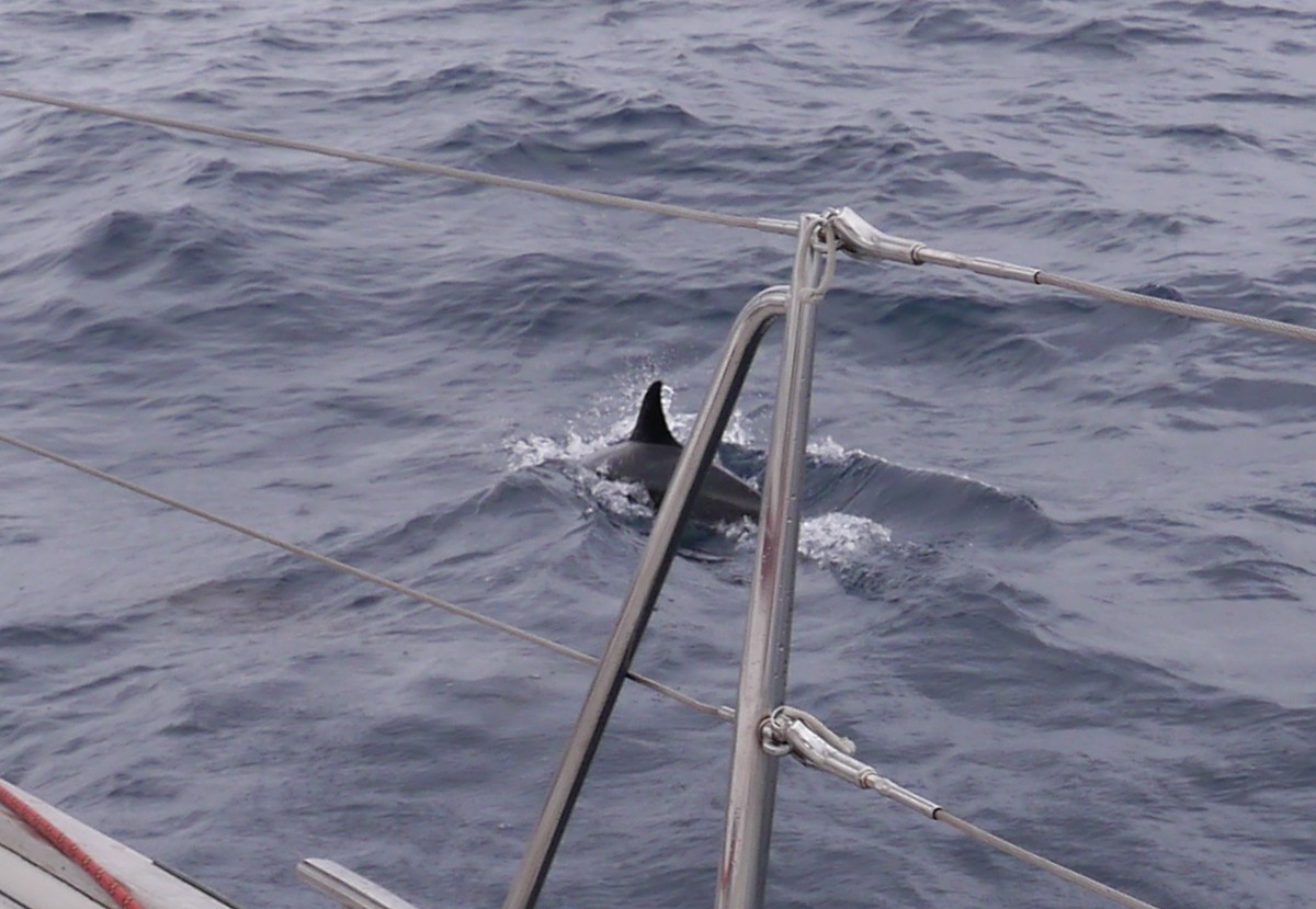 On our next watch we crossed over into deep water and the dolphins came out to play. Dolphin to starboardLittle dolphins with penguin style dark markings over pale undersides. Our course had changed to south, south west and we were making slower progress, so they were gentle companions, languidly keeping pace with us, skimming by alongside or crossing the bow waves. Magical!