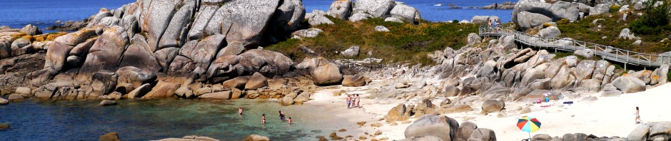 This morning we went a walk the other way around the long arcs of beach, which became increasingly crowded, so we turned back and swam from the beach nearest the marina. The sea seemed less of a challenge, but not much less. John and Johnsey elected to just paddle. A lady with three pugs in tow came down to the sea and carried each in in turn for a bath, to which they seemed resigned rather than enthusiastic. When all had been scrubbed she carried one under each arm to keep them out of the sand, leaving the largest to waddle along behind. By the time we had walked back to Lyra we were dry and after a bit of knitting with the lines we set off for Cambarro at the top of the next ria.