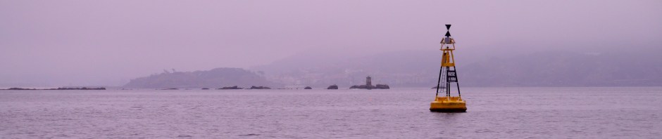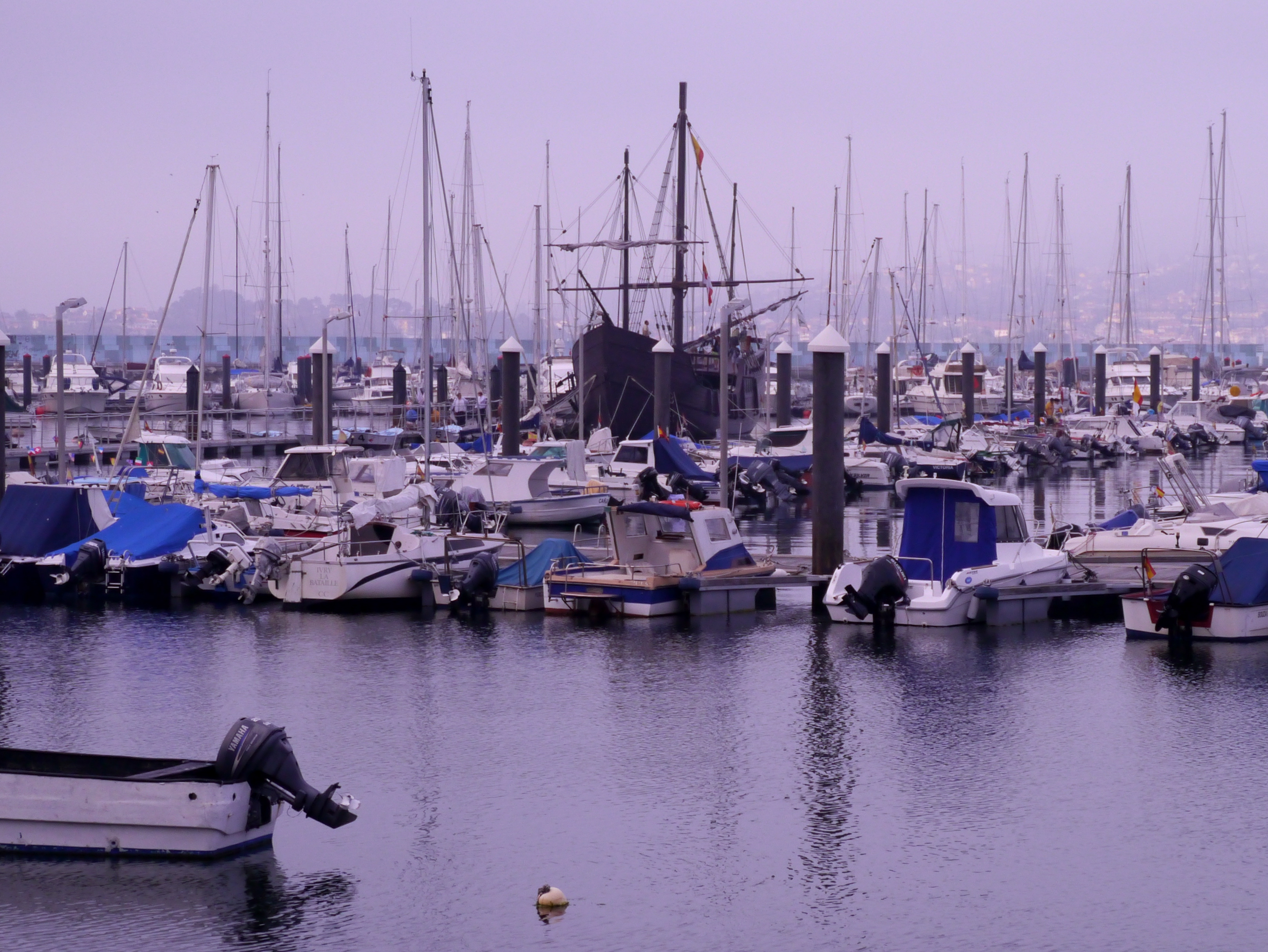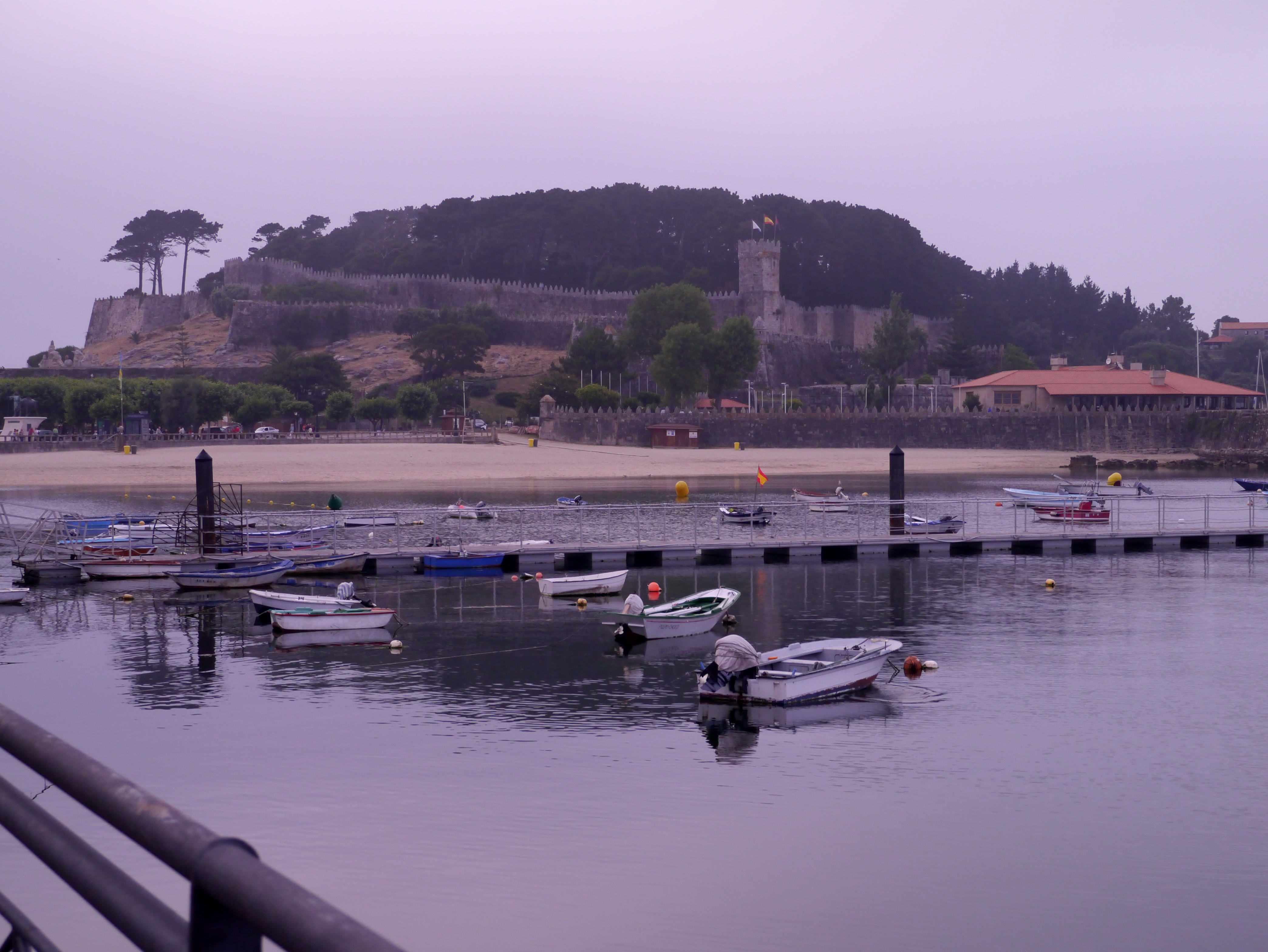 This allowed us to set off for Baiona on Tuesday. The weather was still murky, so we motored along slowly, taking the long way round to avoid the hazards. Baiona is set against steep wooded hillsides, and must be beautiful to approach when they are not shrouded with mist.