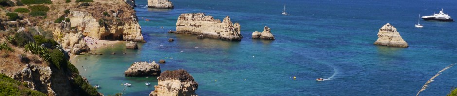 Saturday though was job free. Saturday was our wedding anniversary and we spent the day at leisure. Well, we walked to Ponta da Piedade, which after a short while seemed like hard work , because we had to follow the main road in the heat. Once there it was beautiful. Ragged orange cliffs plunged down to an azure sea, from which rose remnants of previous cliffs, forming picturesque stacks and arches. In the arms of the cliffs were trapped sandy coves, and a substantially built wooden staircase descended from the cliff top to the sand.