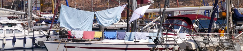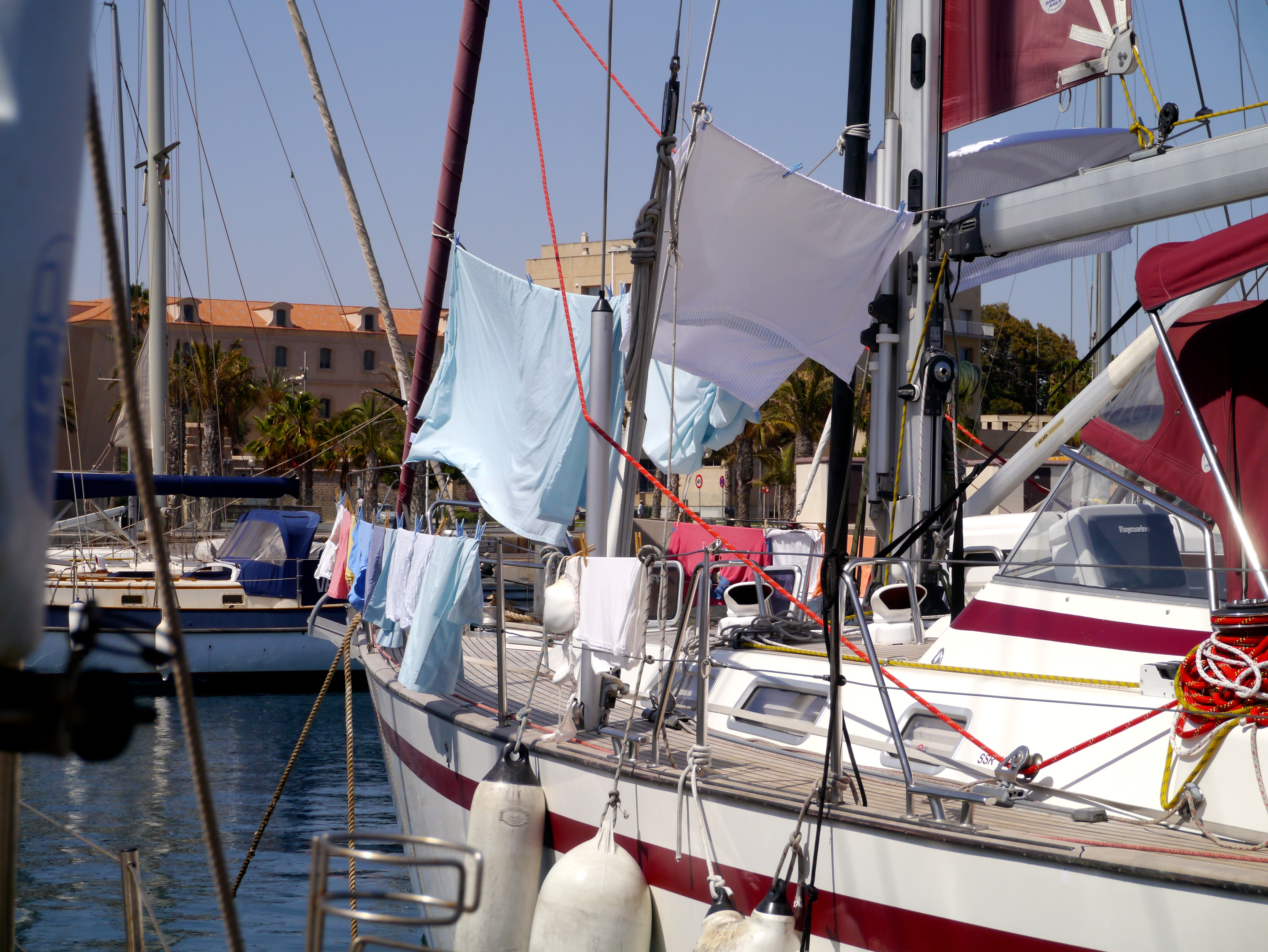 Sunday seems to be our weekly washday. There is a laundry here, but just one machine was working, so we had a go in the Internet café between loads. This is a Portacabin with a single computer. It is not possible to log in on other devices. There is also a machine dispensing chilled drinks, another filled with snacks, a selection of second hand books and two chairs. The chair in front of the screen is relatively comfortable. Nick, who we met in Barbate had managed look quite urbane, sitting in there of an evening with his own glass of red wine. During the day it was stuffy, the screen hard to see and I was on the other chair. John persevered finding data to update the pilot book, while I went back and forth swapping laundry loads. When we had finished Lyra was festooned in our fluttering garments and bedding. Why boats need to display an ensign to inform other craft about owners whose sundries regularly fly from the guardrail is beyond me.